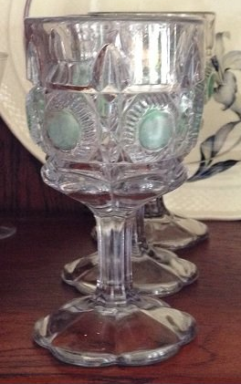 Amerikanske glas, kraftige, støbte. Svag grøn dekoration som ornamentering. Oprindelig med bred guldkant. Højde 15 cm, fod facon som blomst, diameter 8 cm.