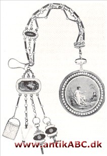 Châtelaine med guldlommeur. Den har ind­fældede biscuitplaketter, hvid og lyseblå emaille og der vedhænger signet, urnøgle, harpe og pung (ABR).