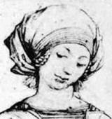 hovedtørklæde; den gifte kvindes almindelige hovedbeklædning i middelalderen.