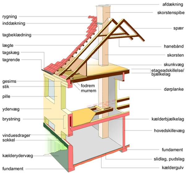 bygningsdele, facader og gavle, dernæst fra væggene omkring trapperum og