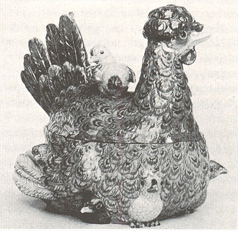 Meissen-terrin udformet som en høne med kyllinger. 18. årh, (ABR).