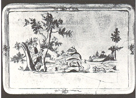 Bakkebordsblad fra Morsø fajancefabrik udsmykket med vildsvin. hund og jægere (ABR).