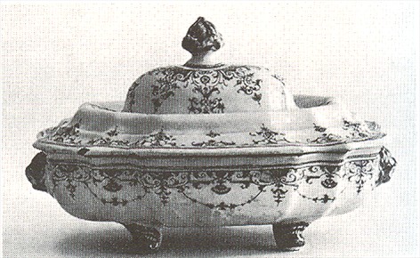 Fajanceterrin. Moustier 1720-40. Dekoreret med Berain mønster (ABR).