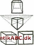 Illustration: øverst: linear perspektiv., for neden t.v.: parallel-pperspektiv, t.h.: omvendt-perspektiv.