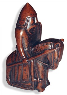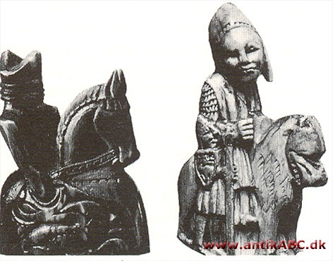 Skakbrikker udskåret af hvalrostand. Brikken t.v. fra det 12. årh., brikken t.h.fra det 14. årh. (Nationalmuseet).