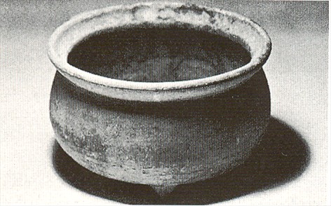 »Jydepotte«, sortbrændt lertøj. Kanden har tre hanke, de to antagelig til ophængning, og skænketud. Mønstrene er glittede (Koldinghus).