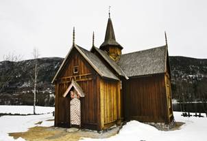 stavkirke (norsk) af tømmerstokke rejst på højkant, fra tidlig