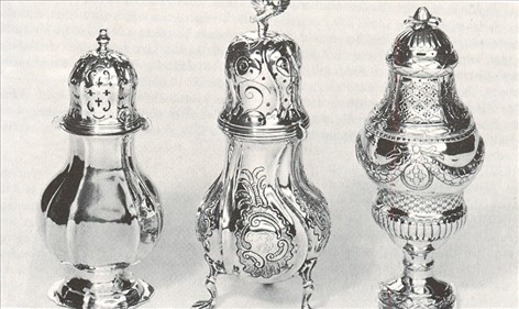 Tre sukkerstrødåser eller bøsser. Dåsen til venstre er ligeknækket og i regence. Mester Christopher Jonsen, København (1750). Dåsen i midten er i rokoko. Mester Hans Budtz Sommerfelt, Aalborg (efter 1761). Dåsen til højre er Louis seize. Mester J. A. C. Kragh, København (1789)
