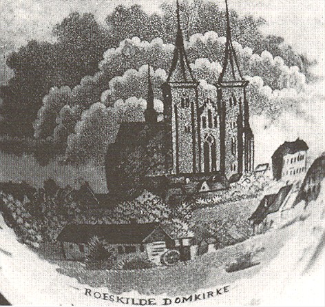 Trykt dekoration på engelsk keramik. Omkring midten af forrige århundrede. Motivet er dansk (Roskilde Domkirke) (Curt Berndorff).