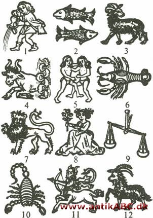 Illustration: 1. Vandmanden, 2. Fiskene, 3. Vædderen, 4. Tyren, 5. Tvillingerne, 6. Krebsen, 7. Løven, 8. Jomfruen, 9. Vægten, 10. Skorpionen, 11. Skytten, 12. Stenbukken.