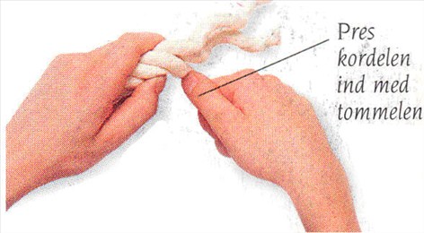 (2) Pres kordelen ind under de to andre kordeler, og hold den fast. Hver af de følgende kordeler snos og lægges på denne måde, indtil den ønskede længde reb er snoet sammen.