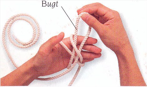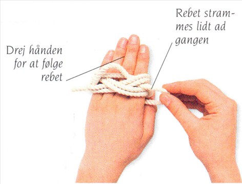 (1) Hold en længde reb i begge hænder. Den del af rebet, der skal ligge underst i øjet, holdes mellem pege- og tommelfinger.