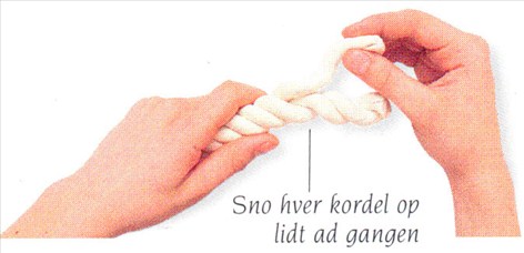Sno forsigtigt to kordeler ud fra tampen på et treslået reb. Tape kordelernes tampe, så de ikke løber op, mens knobet bindes.
