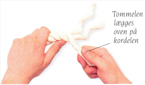 (2) Idet rebet presses nedad, rulles tommelfingeren tilbage langs pegefingeren, så rebet snor sig under sig selv og danner øjet.