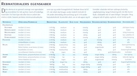 Med hensyn til rebmaterialers egenskaber i forskellige typer reb, henvises til skemaet Rebmaterialers egenskaber.