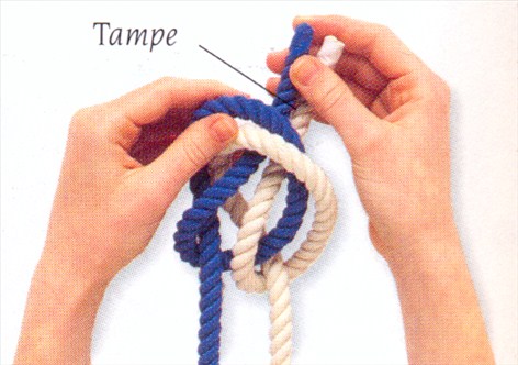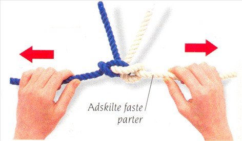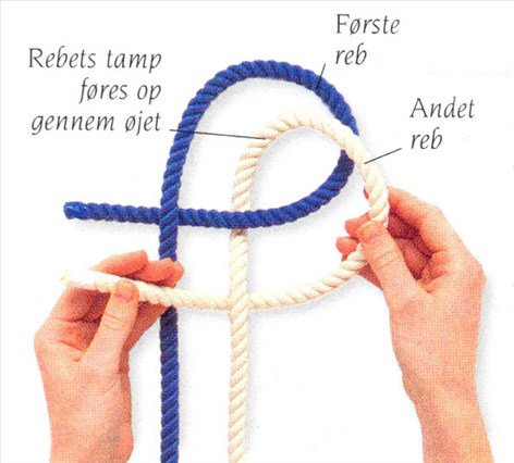 (2) Dan på samme måde et øje på et andet reb, idet tampen først føres gennem det første øje. Læg andet rebs tamp over første rebs faste part.