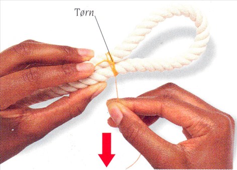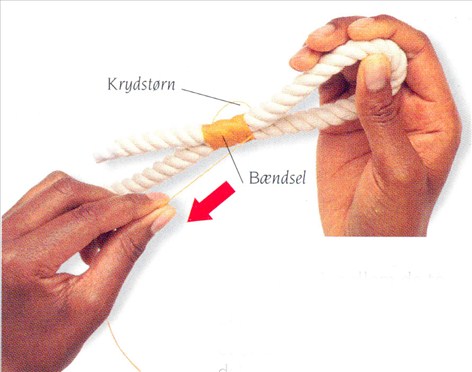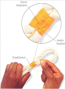 (7) Krydstørnerne låses fast ved, at takkelgarnet føres op mellem de to parter reb. Før det derpå mellem krydstørnerne og under den ene krydstørn. Før takkelgarnet over begge krydstørner, og stik det ind i midten mellem dem.