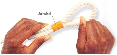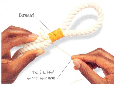 (4) Før takkelgarnet ned under bændslet og op igen mellem de to parter reb i den anden ende af bændslet.