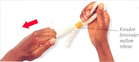 (8) Stram garnet til, så knuden trækkes ned mellem de to parter reb. Afkap garnet, så en kort tamp sidder tilbage.