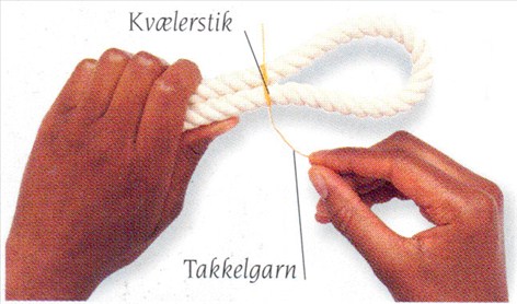 (1) De to parter reb, der skal bændsles, sammenbindes med enden af en længde takkelgarn i et stramt kvælerstik.