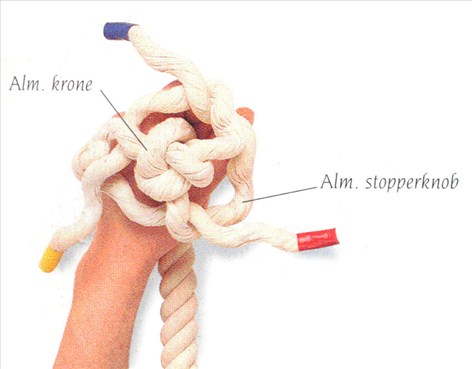 (1) Bind en krone med lange kordeltampe. Stram til, men efterlad et lille øje i midten. Bemærk, at ved binding af en krone føres hver kordeltamp omkring og over den næste kordeltamp.
