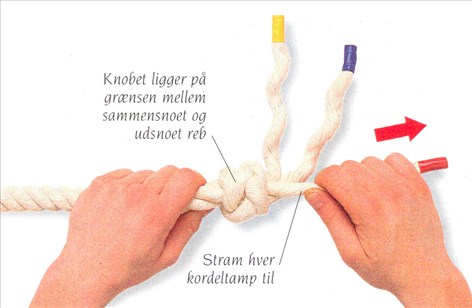 (4) Stram kordeltampene til. Knobet tildannes med fingrene eller et merlespiger, så der dannes en pæn fletning omkring den sammensnoede del af rebet.