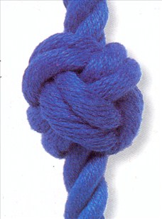 (5) Når knobets kordeler ligger pænt på plads, strammes de op med et sidste træk i hver kordeltamp. Bindes knobet i enden af et reb, kappes kordeltampene af.