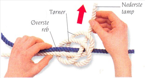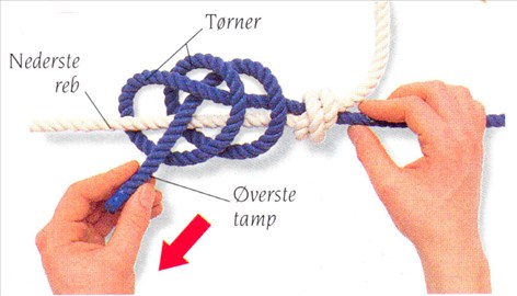 (2) Læg to tørner med nederste tamp omkring øverste reb. Før nederste tamp gennem tørnerne. Stram knobet til.