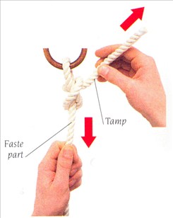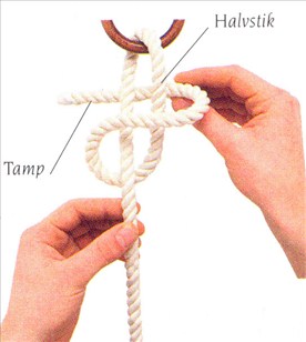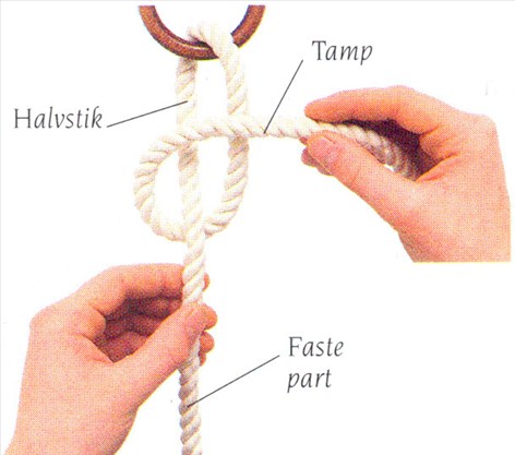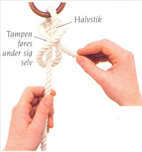 (1) Før tampen af et reb nedefra og op gennem en ring Før tampen under den faste part, så der dannes et halvstik. Før tampen op over halvstikket.
