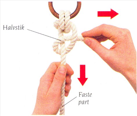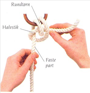 (3) Slå endnu et halvstik ved at føre tampen ned under og derpå op over den faste part, og stikke den under sig selv. Stram stikket ved at trække i den faste part og tampen.