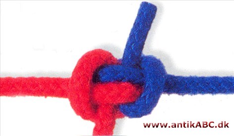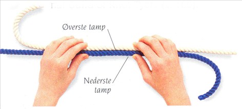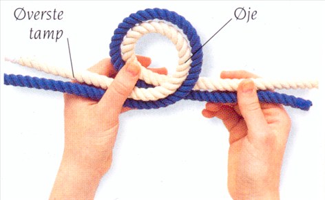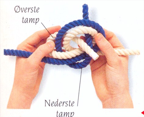 (3) Stik øverste tamp, der nu holdes i venstre hånd, nedefra og op gennem øjet. Stik nederste tamp, der nu holdes i højre hånd oppefra og ned gennem øjet.