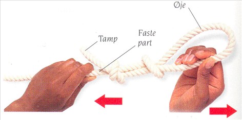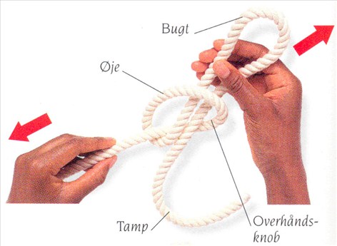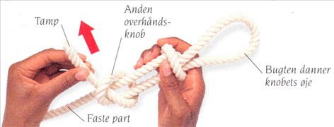 (2) For at binde andet overhåndsknob føres tampen over den faste part og omkring sig selv. Stik tampen under sig selv, og stram andet overhåndsknob ved at trække i den.