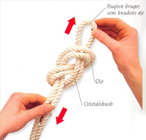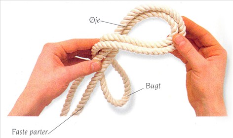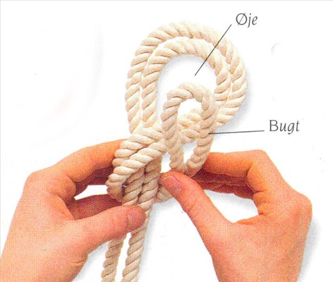 (1) Dan en bugt ved at lægge en længde reb dobbelt. Læg et øje ved at føre bugten over og derpå under de faste parter.