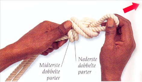 (3) Stram knuden ved at trække i bugten. Skub samtidig de nederste dobbelte parter over de midterste dobbelte parter og ind midt på knobet.