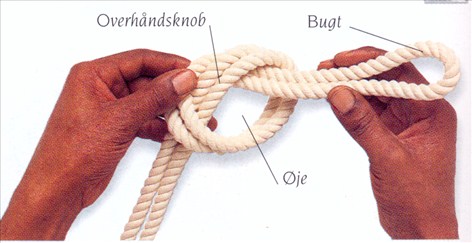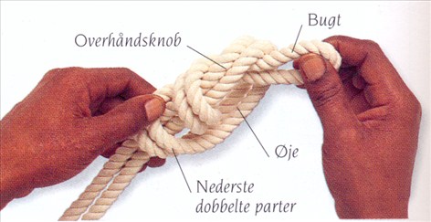 (1) En længde reb lægges dobbelt, så der dannes en bugt i den ene ende. Bind et overhåndsknob nær bugten, så der dannes et stort øje midt i knobet.