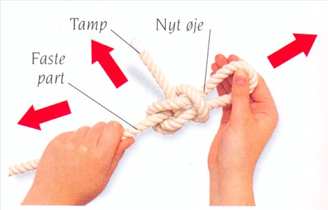 (4) Træk den fulde tørn gennem øjet, så der dannes et nyt øje. Stram knuden ved at trække i det nye øje, den faste part og tampen.