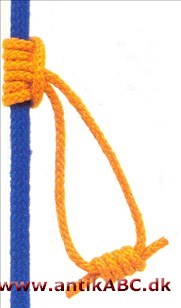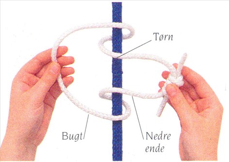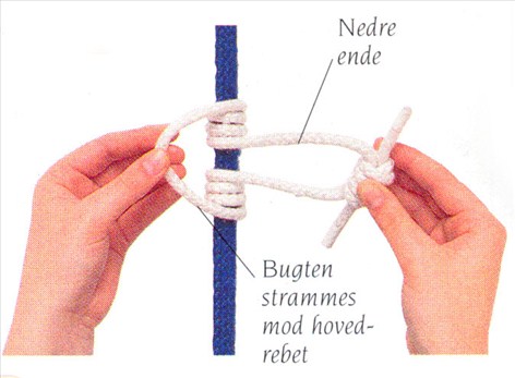 (3) Den nedre ende vikles mindst tre gange om hovedrebet og gennem bugten. Træk i den nedre ende for hver tørn for at forkorte bugten. Stram knuden ved at belaste slyngens nedre ende.