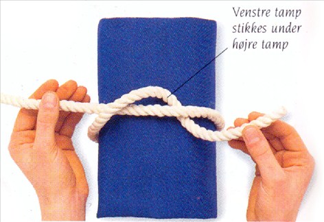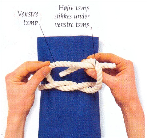 (3) Stik den tamp, der nu ligger til højre for knobet, over og derpå under den tamp, der ligger til venstre for knobet.