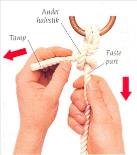 (3) Læg endnu et halvstik ved at føre tampen under og omkring den faste part og stikke den under sig selv, Stram stikket ved at trække i tampen og den faste part.