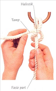 (2) Før tampen ind over og derpå om bag den faste part. Før denigen op over stikket, og stik den under sig selv i et halvstik.
