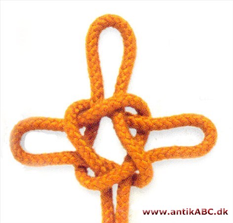 Dette simple kors er bundet med de to ender af samme reb. Begynd med at følge Trin 1-2 som i kærlighedsknobet, så de løse overhåndsknob sammenbindes.