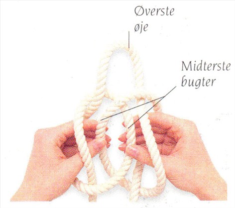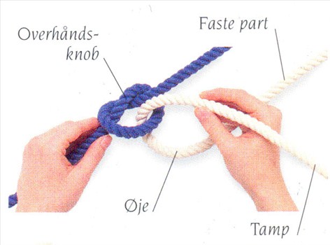 (1) Bind et overhåndsknob inde på en længde reb. Før tampen af et andet reb op gennem overhåndsknobet. og læg den derpå over sin egen faste part, så der dannes et øje.