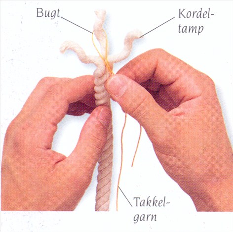(3) Takkelgarnet vikles om rebet ud mod rebets tamp. Bugten og den korte garntamp skal være fri.