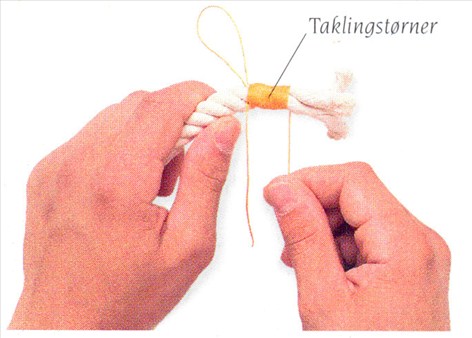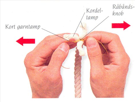 (8) Før den korte garntamp og takkelgarnet ind midt mellem kordeltampene fra hver sin side af rebet. Bind et råbåndsknob og stram det til, så det ligger midt inde mellem kordeltampene