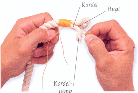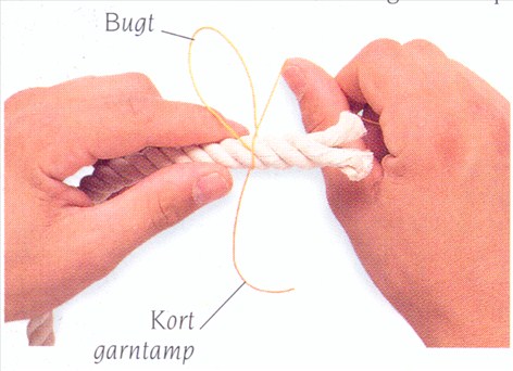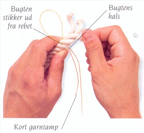 (2) Sno kordeltampene sammen igen, så bugtens hals ligger midt inde i rebet, og så der afsættes en kort garntamp.
