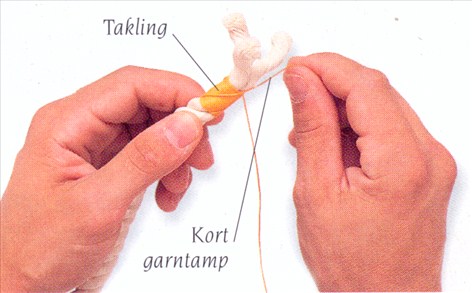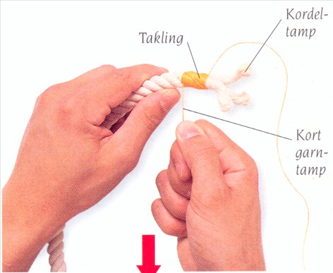(6) Træk i den korte garntamp, så bugten strammes over taklingen og over kordel- tampen.