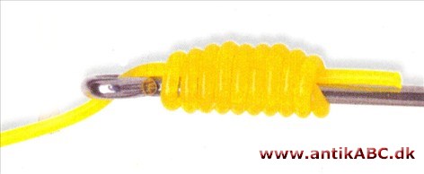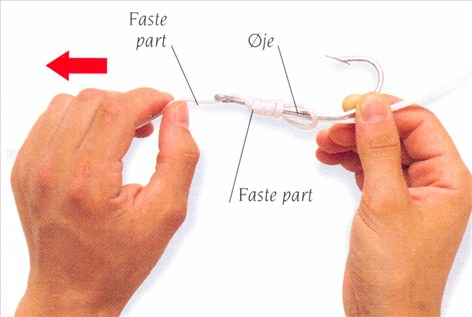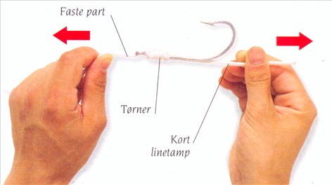 (6) For at stramme tørnerne trækker man hårdt i den faste part og i den korte linetamp, så tørnerne kommer til at ligge tæt sammen omkring krogens skaft.