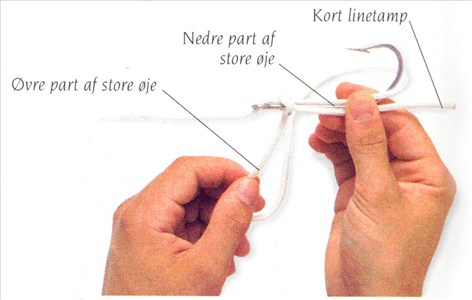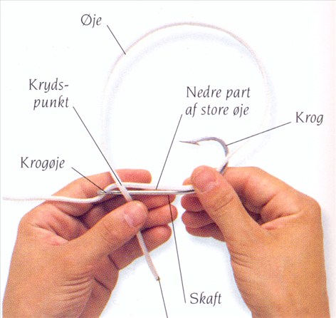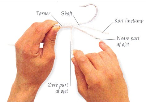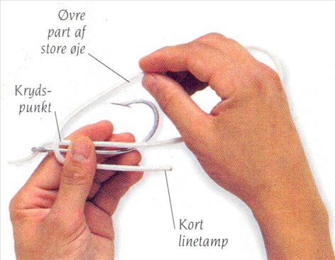 Træk linen igennem Dan et stort øje ved at føre linen over sig selv lige over krogøjet. Dette er krydspunktet. En kort linetamp skal ligge under krydspunktet. Hold øjets nederste part parallelt med krogens skaft.