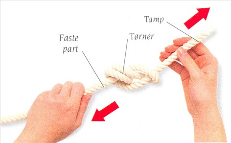 (4) Stram knobet til ved at trække i den faste part og tampen. Man kan stramme knobet endnu mere ved at trække de to ekstra tørner mod den faste part.