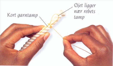 (1) Lav et øje med en kort tamp i den ene ende af en længde takkelgarn. Øje og garntamp lægges langs et reb, og derpå vikles garnet først ned under og derpå omkring rebet, så øjet låses.